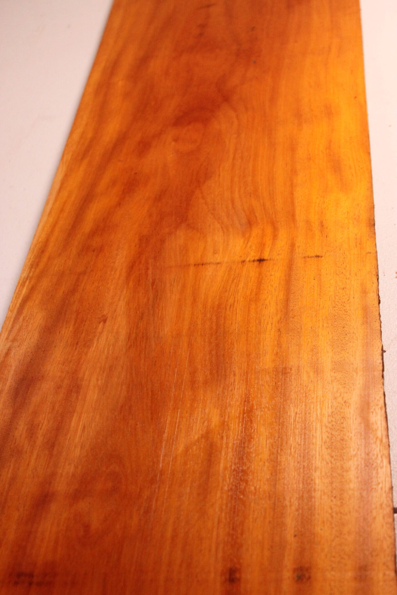 Bilinga Opepe S2S Board - Specialty Lumber from Africa that boasts excellent coloration ranging from bright gold to vibrant orange sunset with a copper luster. The heartwood is extremely resistant to fungi (class 1), and similar to greenheart, it is most durable around marine or brackish waters. Highly resistant to decay, termite attacks and marine borers. Grain is usually interlocked and will slowly darken to an orange brown unless sealed.